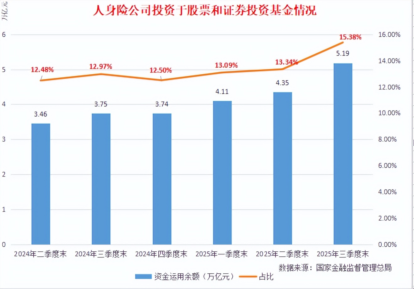 环球网记者进一步梳理发现,人身险公司投资于股票和证券投资基金的余额总体呈逐季度递增态势。从资金运用占比情况来看,在梳理的时间区间内,2024年二季度末至2025年二季度末,稳定在12.4%至13.4%之间,而到了2025年三季度末,这一占比跃升至15.38%。