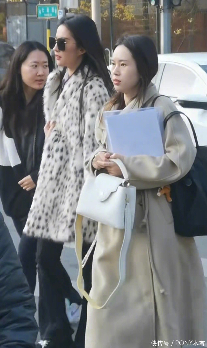 除了龙猫外套,她还穿过一款米黄色的皮草外套,内搭灰色V领针织衫和蓝色复古直筒牛仔裤,拎黑色包包,相对龙猫外套,更加年轻化!